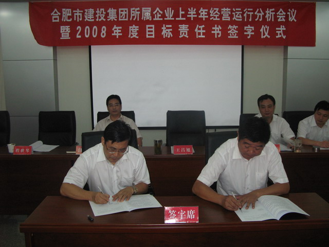 7月23日下午,集团公司所属企业上半年经营运行分析会议暨2008年度目标责任书签字仪式在301会议室召开。集团公司领导王昌旭、吴晓东、陆勤航、程世琴,市国资委业绩考核处处长汪浩、稽查员许国汉,八家所属企业全体领导班子成员及集团公司相关部门负责人参加会议。会议由集团公司副总经理吴晓东主持。