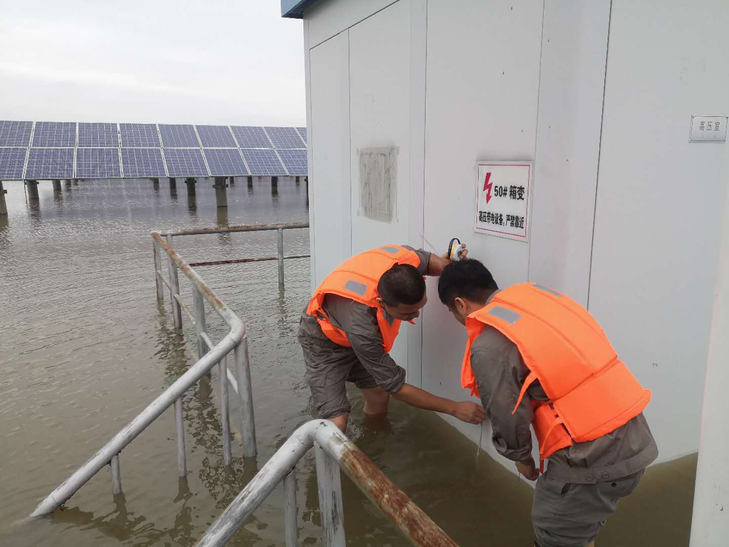 面对险情,金太阳公司干部职工临危不乱、判断准确、措施有力、团结一心,用超强的安全责任心、过硬的应急处置能力,牢牢将安全主动权把握在手中。连续奋战多日后,电站洪灾形势有所好转,金太阳公司迅速制定了周密的复产抢修方案,紧张有序地开展环圩河电站复产前安全隐患排查。尽管环圩河的水位已有所下降,但整片区域水势仍处于高位状态。在确保人员安全的前提下,电站运维人员划船涉水人工推行,对站外55个箱变单元、逆变器、桥架、汇流箱等设备的进水情况以及35KV高压室的各电气设备逐一进行排查,以确保后期设备安全运行、电站顺利复产。截至21日下午,设备安全隐患排查工作已全部完成。