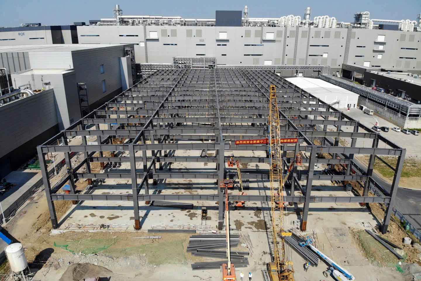 9月9日上午9时,随着最后一根主钢梁吊装完毕,康宁玻璃基板设施建设项目二期主体钢结构工程正式封顶,标志着该项目即将全面进入主体围护结构、机电安装和装饰装修施工阶段。